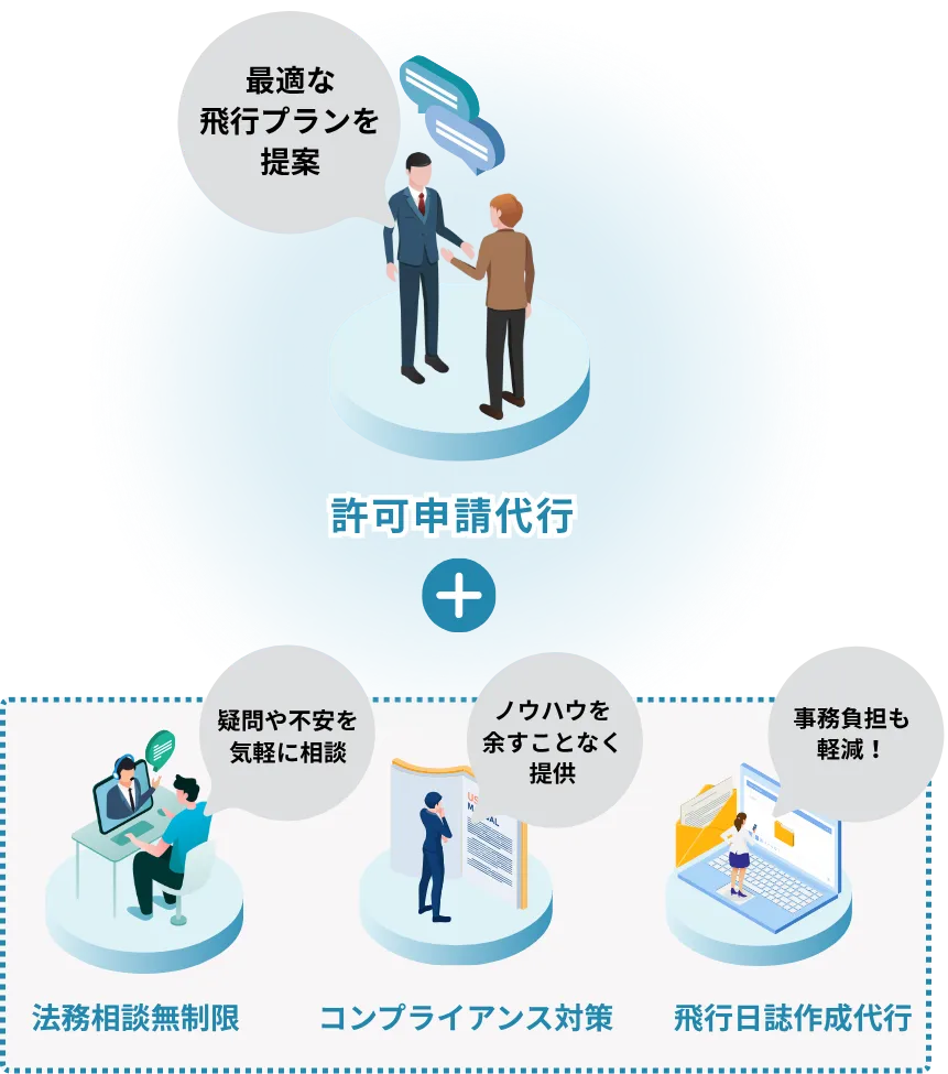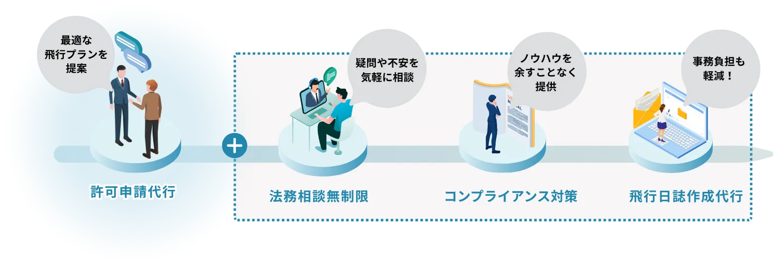 許可の取得だけでなく、実際の飛行に必要なサポートも標準でご提供していますので、安心してお任せください。