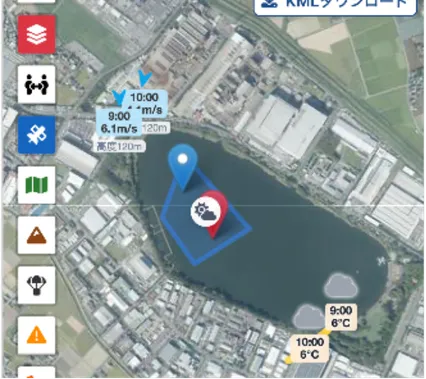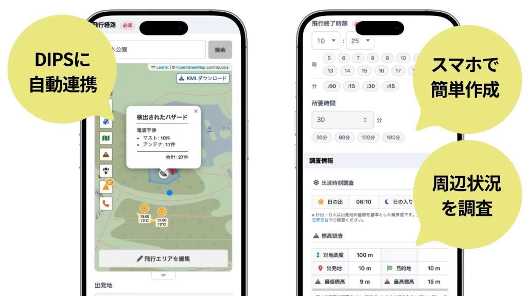 このアプリを使えば、飛行計画の通報はもちろん、周辺の規制情報や天候などの飛行リスク確認までアプリ上で完結します。