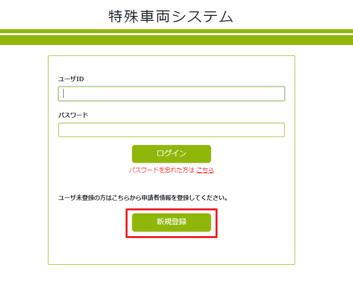 ▲特殊車両システムのログイン画面が表示されるので、「新規登録」をクリックします。
