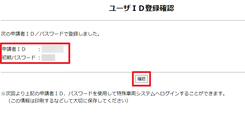 申請者IDと初期パスワードを確認したら、「確認」ボタンをクリックします。